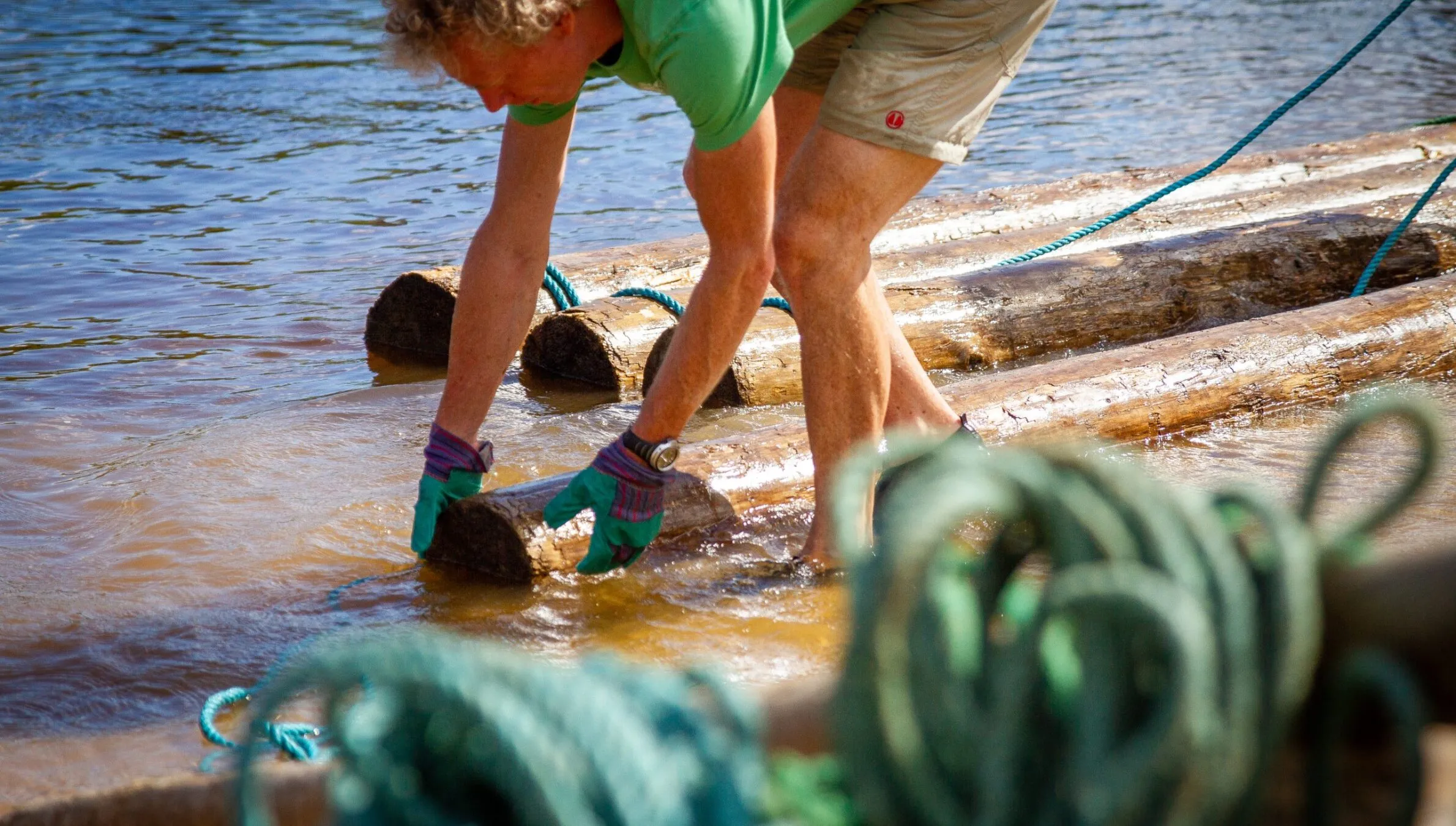 Die Knotentechnik, mit der wir die Stämme zu einem Floß zusammensetzen, kann auf den ersten Blick kompliziert aussehen, aber nach einer Ausbildung und mit Hilfe eines Instrukteurs während des Baus kann das jeder und jede schaffen. Ein Holzfloß zu bauen ist eigentlich nicht so schwierig, aber es ist eine körperlich schwere Arbeit. Die zu verwendenden Stämme liegen in Stapeln am Ufer. Von dort müssen sie ins Wasser getragen oder, wann immer möglich, kraftsparend gerollt werden. Der Bau selbst und alle Knoten werden im Wasser gemacht, denn das Floß wird zu schwer, um es am Ende vom Land ins Wasser zu bugsieren. Auch wenn es eine physische Herausforderung ist, geht es beim Bau eines Holzfloßes vor allem um Zusammenarbeit und gegenseitige Hilfe. Alle müssen mit anpacken und alle können ein Holzfloß bauen.